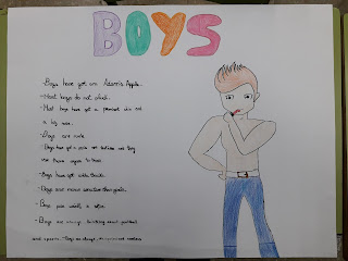 On 25th November, we celebrated the International Day for the Elimination of Violence against Women. We decided to work on gender role stereotypes with some of the students in first and second year secondary school. They were requested to describe what the opposite gender is like, so boys described girls and girls described boys, and they also had to draw someone of the opposite gender performing an activity which they consider is not typical.